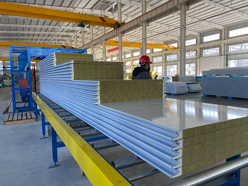 3.強(qiáng)度優(yōu)良:聚氨酯封邊巖棉板材料與兩層鋼板一體粘合,在共同作業(yè)的基礎(chǔ)上,再從頂板的上面加入波壓模具。其整體的剛度與夾有壓模夾板的巖棉(玻璃絲棉)的現(xiàn)場(chǎng)的復(fù)合板材相比相差甚遠(yuǎn)。通過連接條和板卡進(jìn)行固定,大幅提高了頂面整體的剛性,強(qiáng)化了頂面整體的工作性能。因?yàn)檫x擇巖棉的芯板,能采用大的螺距,能節(jié)約分片量的1/3 ~ 2/3。